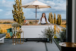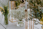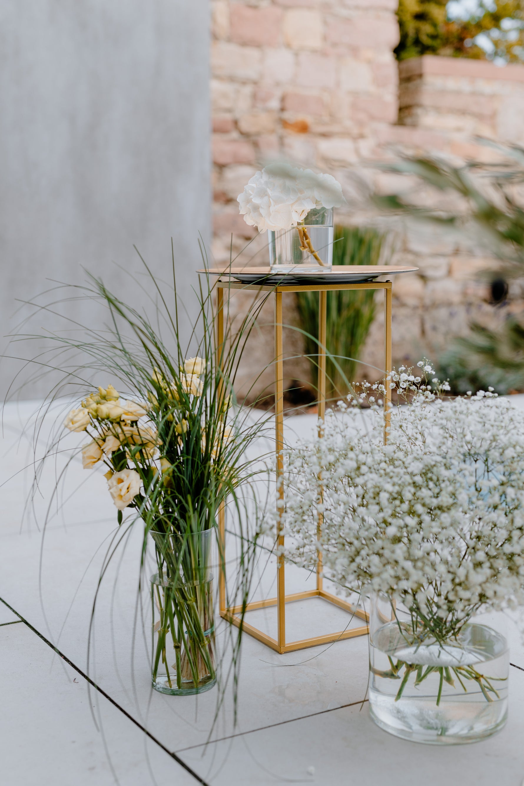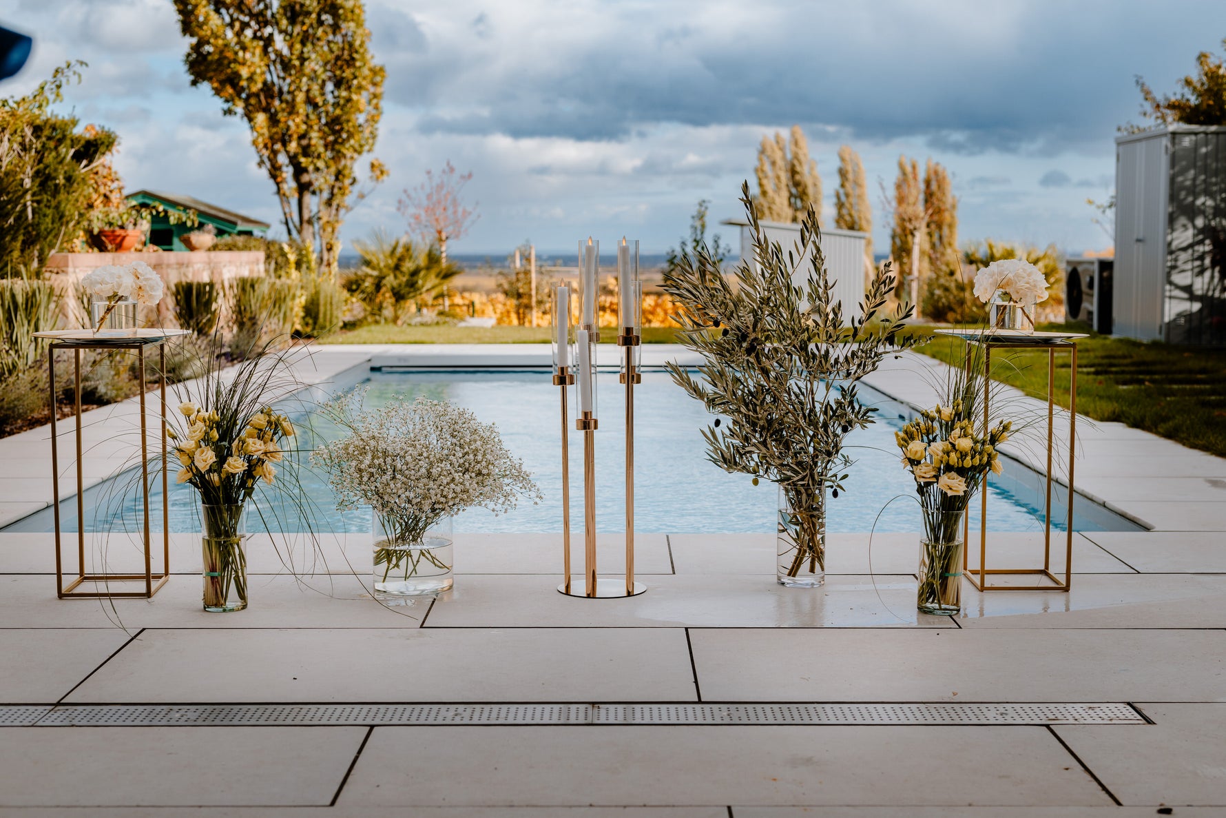 Verleihe deinem Event eine ruhige und elegante Note mit unserem Blumenpaket "Ivory & Alba": goldene Säulen, ein LED-Kerzenständer, große Glasvasen mit handverlesenen Blumen in weißer Farbpalette, dazu Schleierkraut in einer Vase und dekorative Olivenstängel — alles abgestimmt auf die stilvolle Pool‑ oder Gartenkulisse des gezeigten Arrangements.