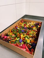 Im Mittelpunkt stehen handverlesene Gemüsekomponenten – zarter Salat, Rucola, Gurke, Paprika, Karotten und sonnengereifte Tomaten – kunstvoll angerichtet und begleitet von Crackern sowie einem samtigen Rote-Bete-Hummus, der mit seiner erdigen Note und leuchtenden Farbe begeistert. Ergänzt wird die Box durch eine saisonale Auswahl frischer Früchte, essbare Blüten sowie würzige Kresse aus Rheinzabern – regional, aromatisch und charakterstark.