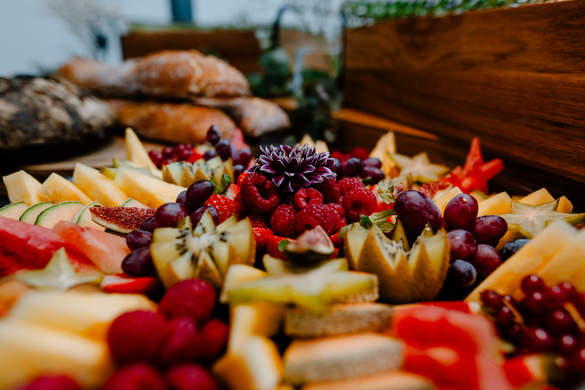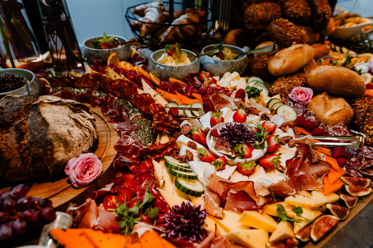 Verleihe deinem nächsten Event einen Hauch von Exklusivität mit unseren kunstvoll gestalteten Grazing Tables. Diese besondere und köstliche Alternative zu herkömmlichen Buffets begeistert nicht nur den Gaumen, sondern auch das Auge! Lass dich von einer bunten Palette erlesener Käsesorten, leckeren Wurstwaren, frischen Früchten, knackigem Gemüse, Dips und vielem mehr verführen - wir garantieren ein Fest für die Sinne!