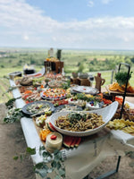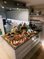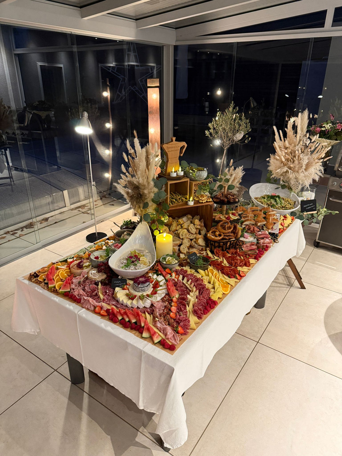 - "360° Boho-Style" Ein rundum zugänglicher Grazing Table auf einem großzügigen Tisch (mindestens 1,60 m × 1,60 m), kunstvoll gestuft als sogenannter Layered-Table und dekoriert mit Trockenblumen, Kerzen und natürlichen Boho-Style-Elementen. Diese Variante schafft eine warme, einladende Atmosphäre und wird mit einem Aufpreis von 30 € berechnet.